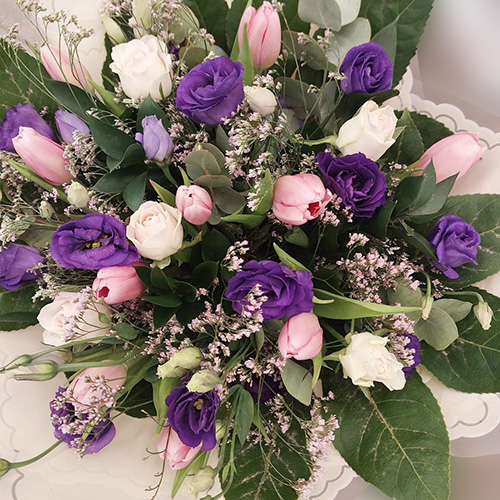 זר שזור המורכב מורדים, ליזיאנטוס, טוליפים ואלמנטים ירוקים מגיע עם קישוט באריזת נייר מהודרת. זר המיועד לכל אירוע או מתנה.